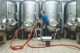 Dieser helle Most wird in Tanks gelagert und beginnt dort zu gären. Die Gärung wird durch Hefen, die wir in Form von speziell für uns entwickelten Reinzuchthefen sofort nach der Pressung des Mostes zugeben, in Gang gesetzt. Dabei wird aus dem Fruchtzucker der Trauben Alkohol und Kohlensäure gebildet.